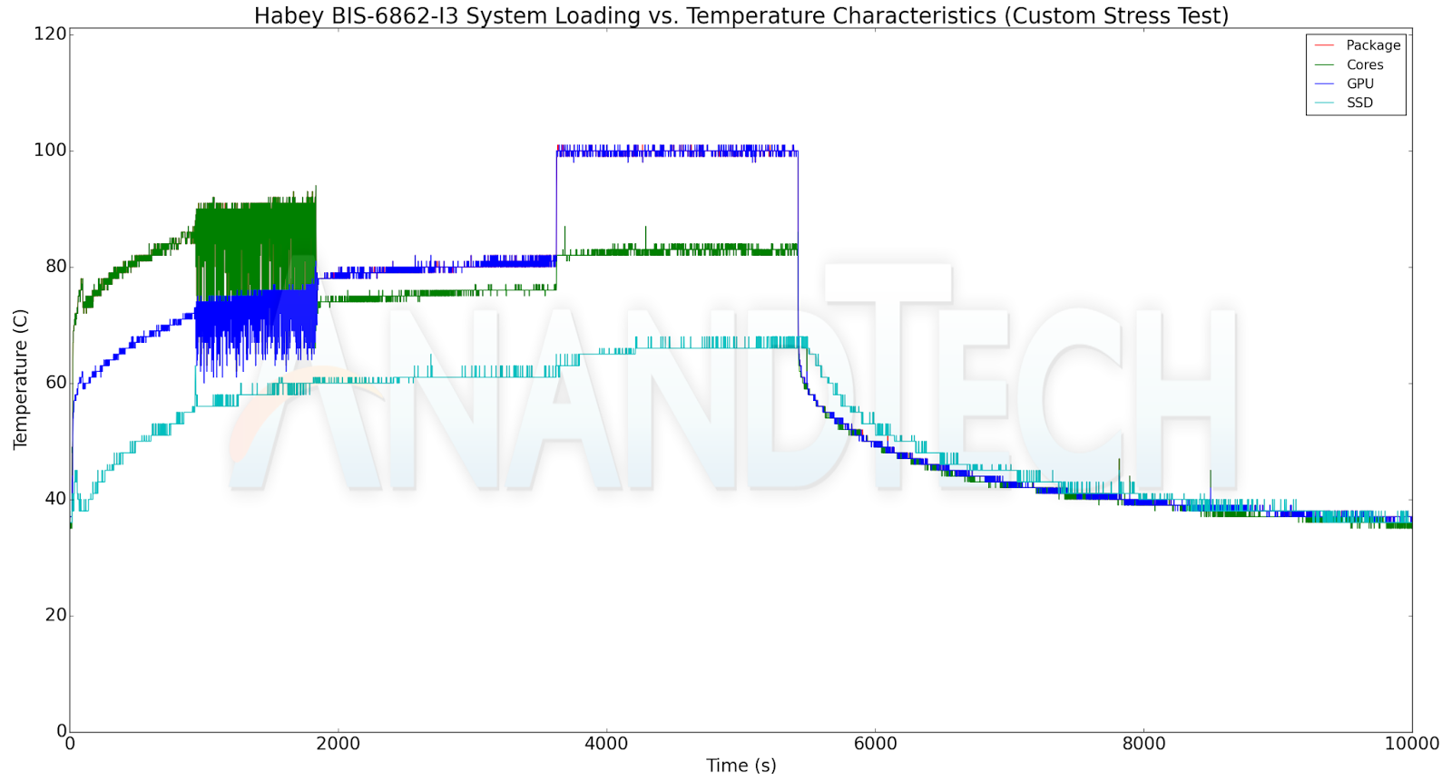 The Prime95 power virus test shows the protection mechanism kicking into action in the Habey system. After 15 minutes of continuous load, we see the power consumption at the wall going from around 30W to start oscillating between 18W and 32W. Correspondingly, the package power oscillates around the 15W mark. The protection against the power virus workload starts kicking in as soon as the package temperature reaches the 80C mark...